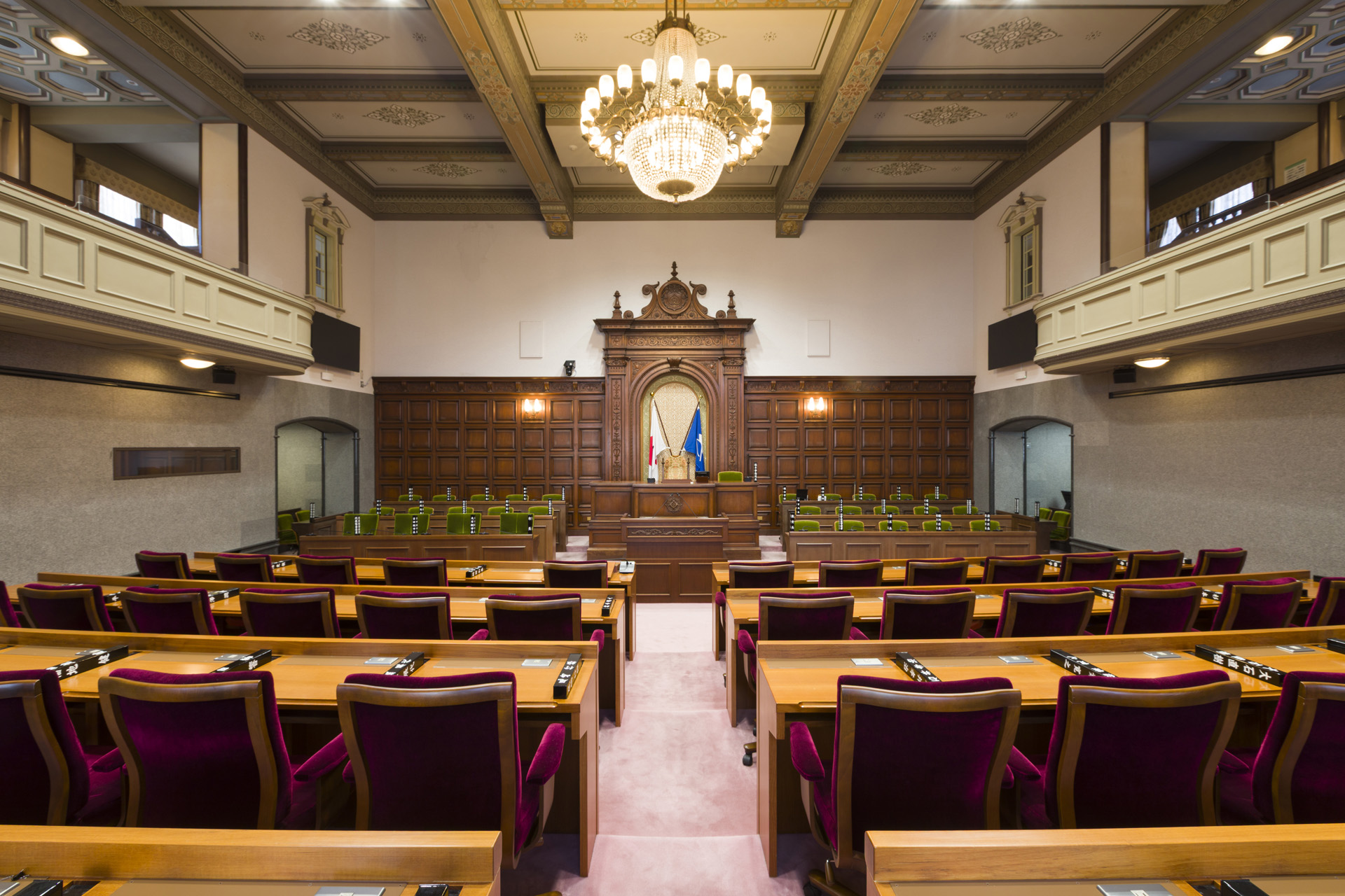 重厚感のある内装と豪華なシャンデリアやステンドグラスが特徴の議場に相応しい、