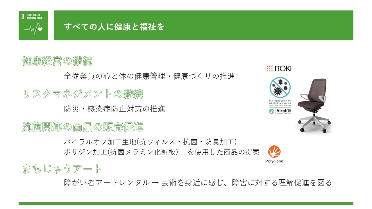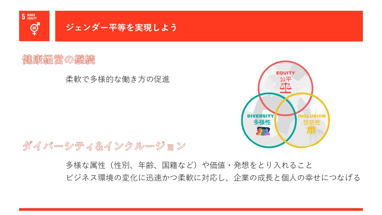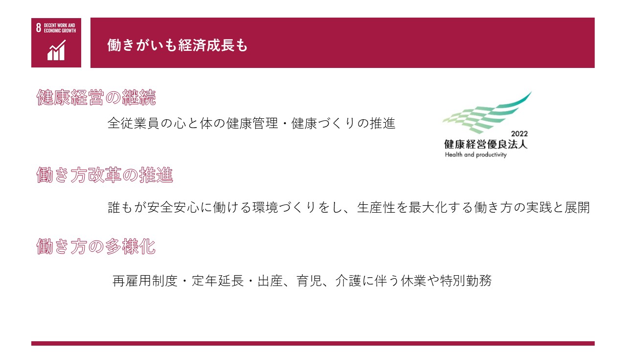 当社は、【社会貢献・働き方改革・環境経営・健康経営・地域創生】の5項目を目標に掲げ宣言いたしました。