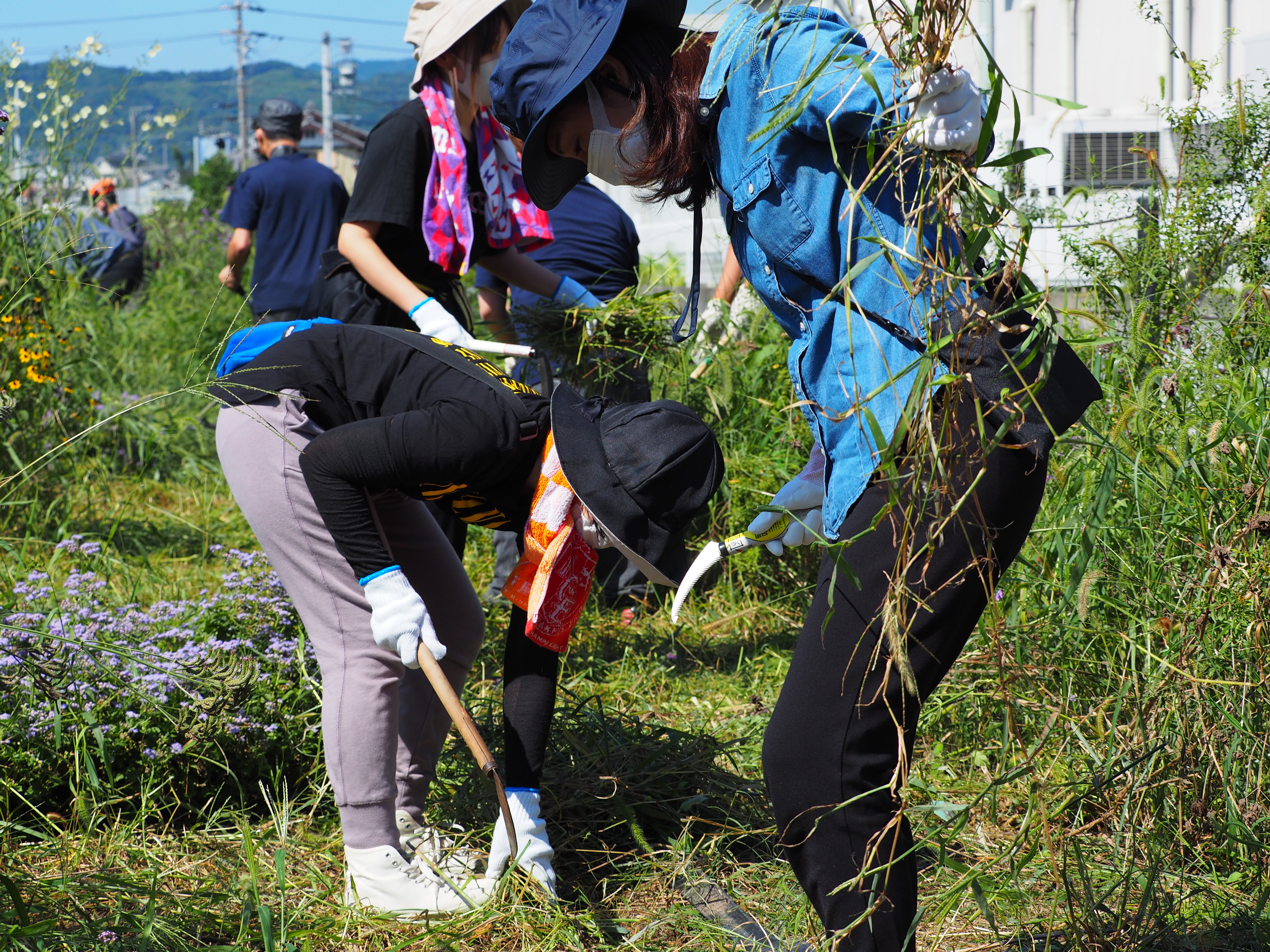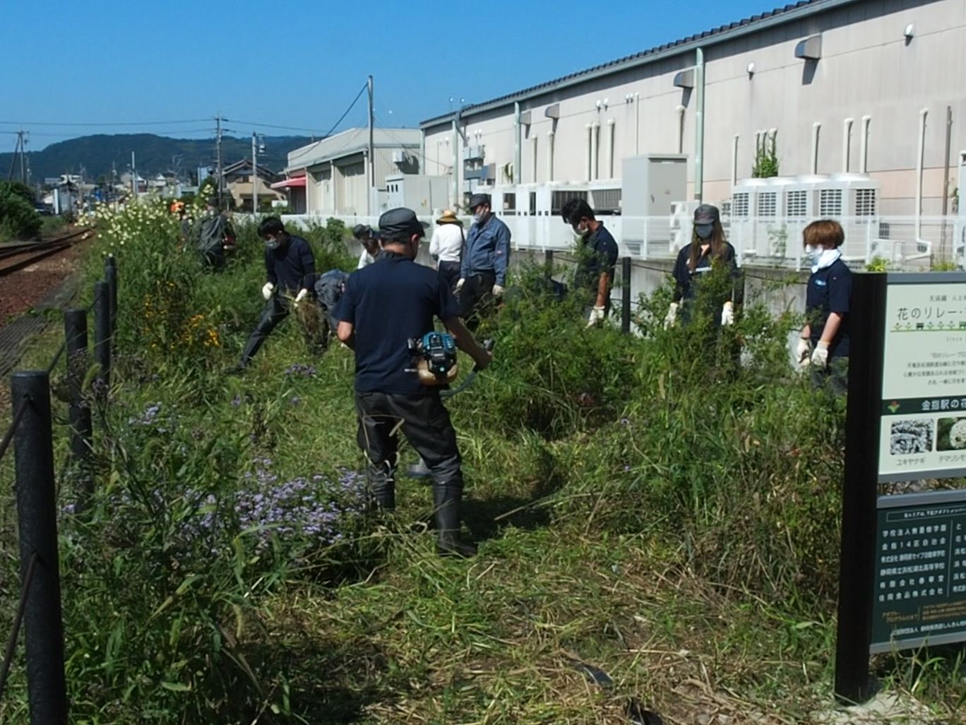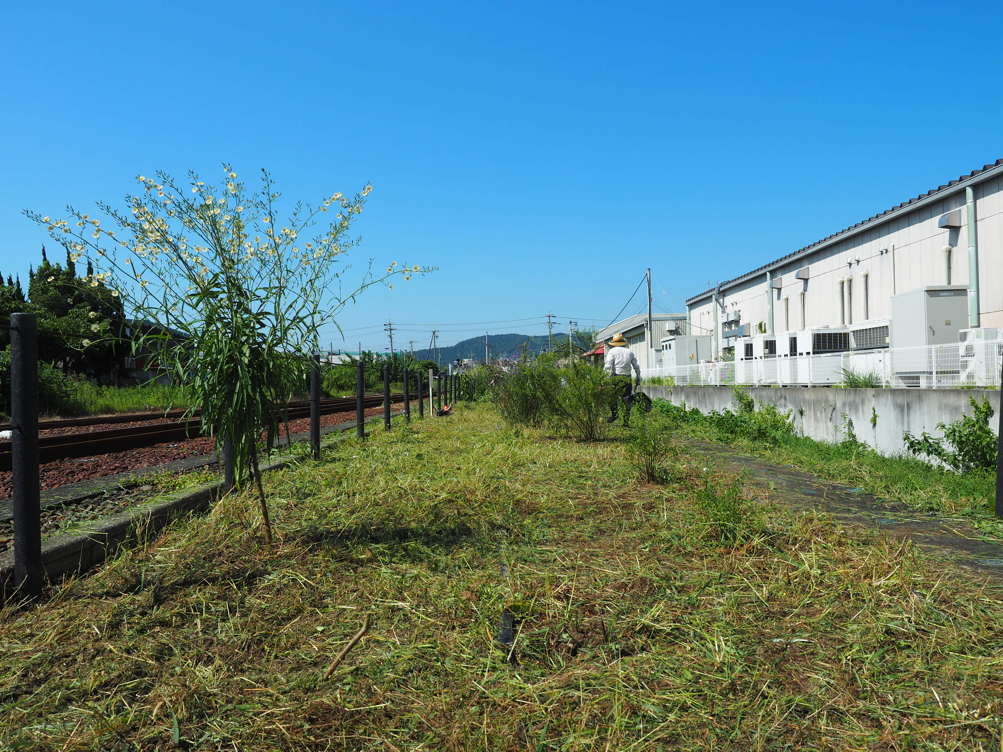 当社の女性従業員6人が9月23日、天竜浜名湖鉄道の金指駅近くで草刈りのボランティアを行いました。秋とは思えないほどの汗ばむ陽気の中、鎌や草刈り機を手に夏の間に伸びた雑草を刈ること2時間。作業開始時はこんなに雑草が生い茂っていましたが…