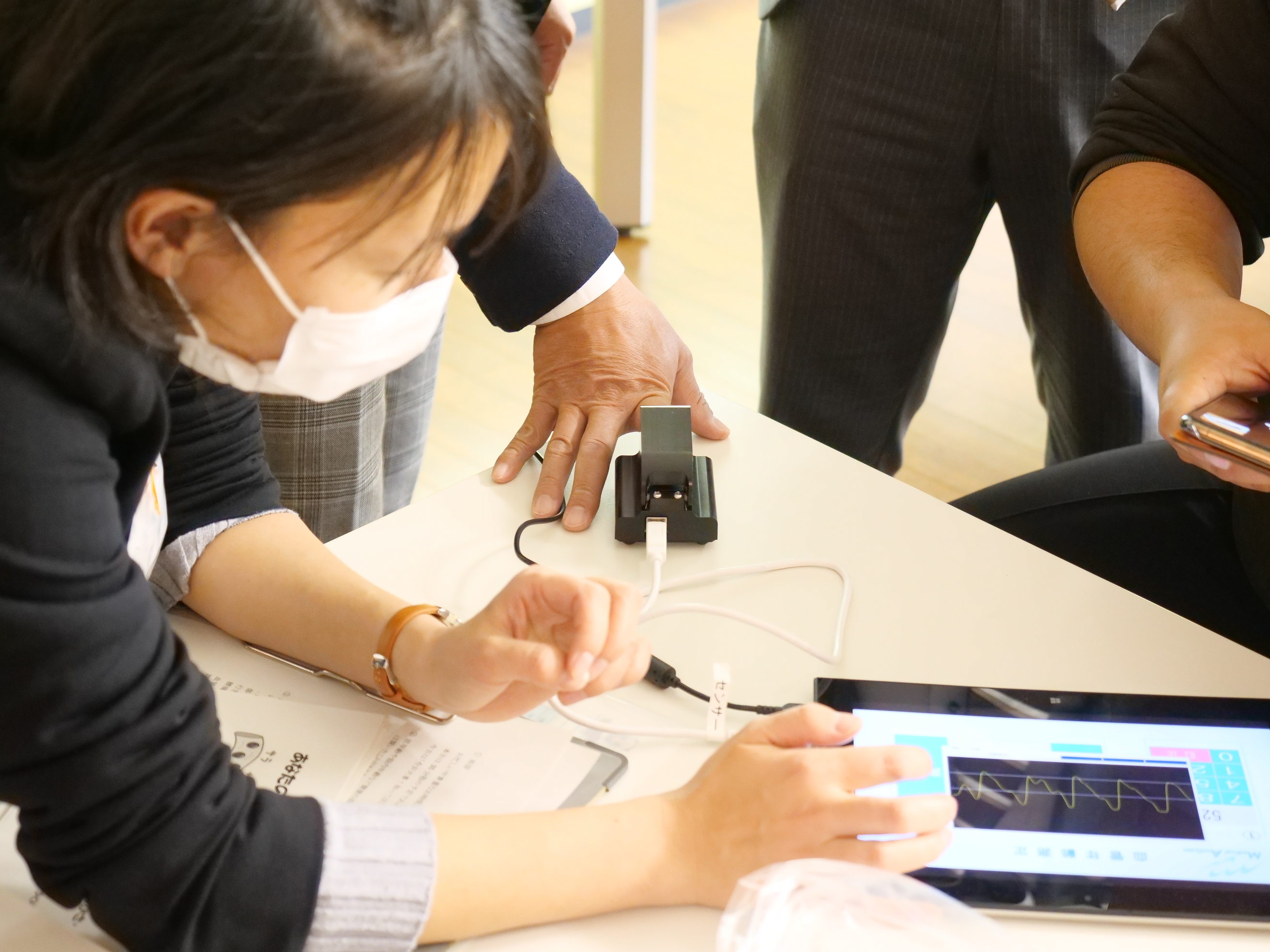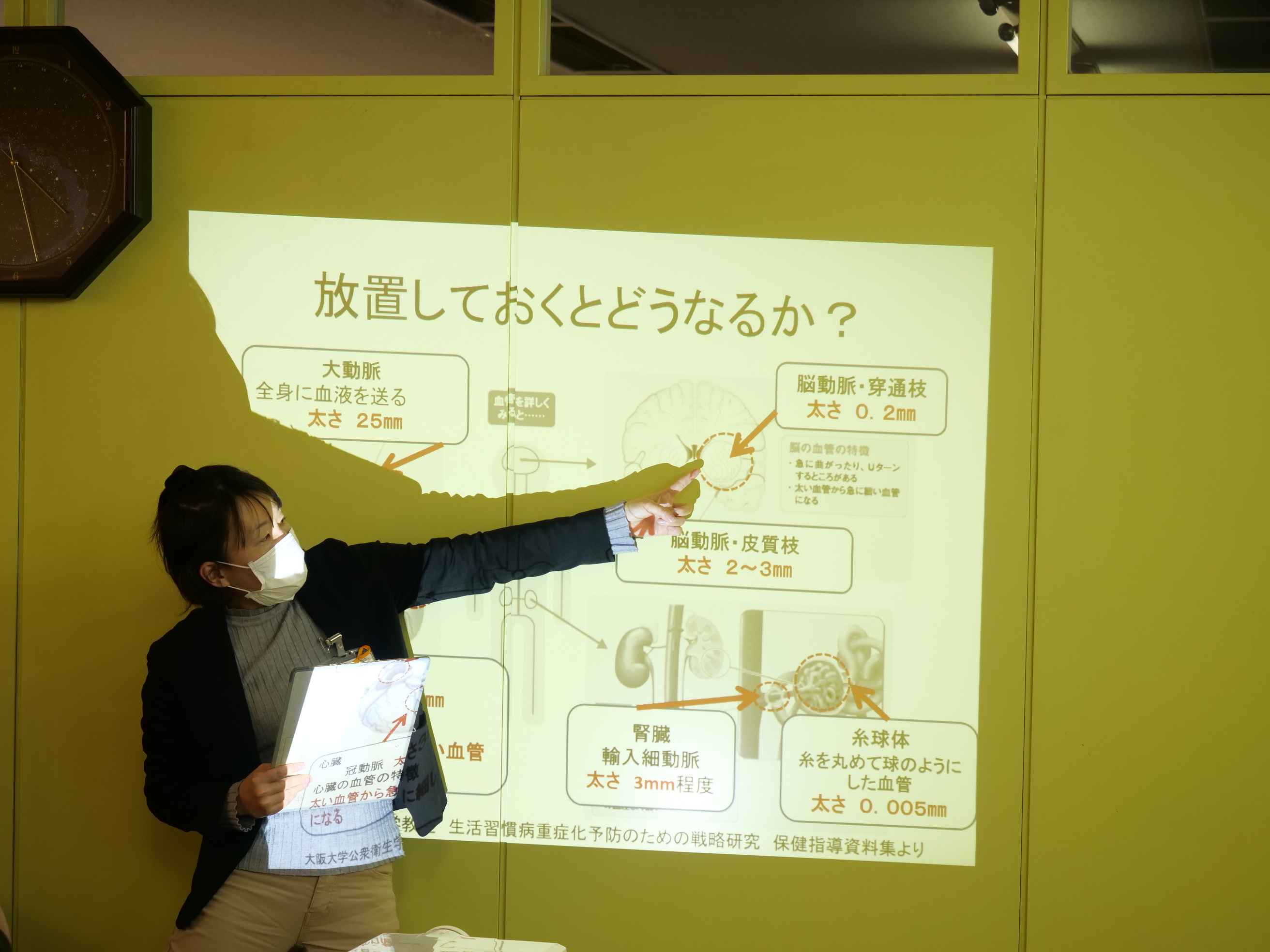 セミナーの参加者は、市職員の方に用意していただいた装置で血管年齢を測定。血管年齢が実年齢より高かった参加者は、生活改善への意識を高めていました。