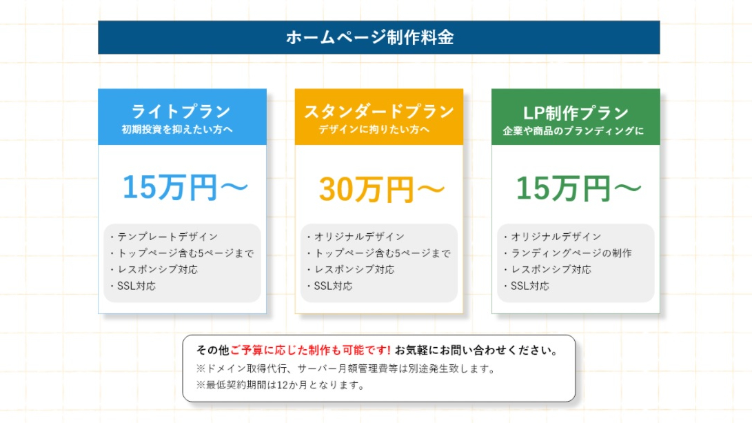 広告の運用代行はもちろん、ビジネスの魅力を引き出す写真や動画・キャッチコピーなどのコンテンツ制作やIWebブランディングに欠かせないホームページの制作、求人広告のご要望にも対応致します。