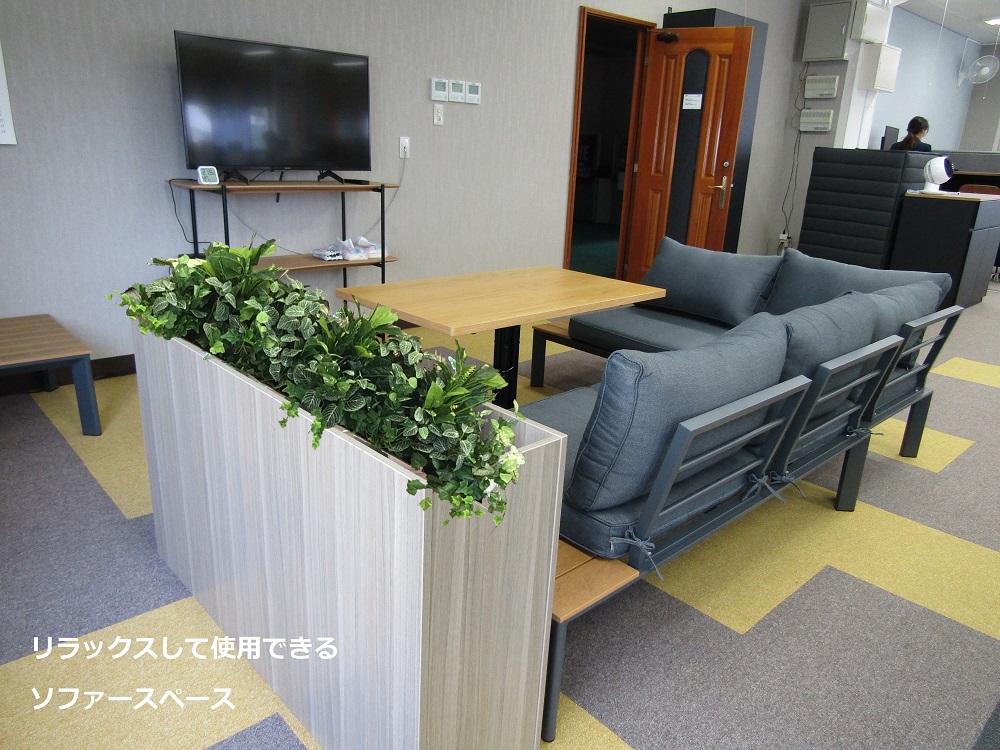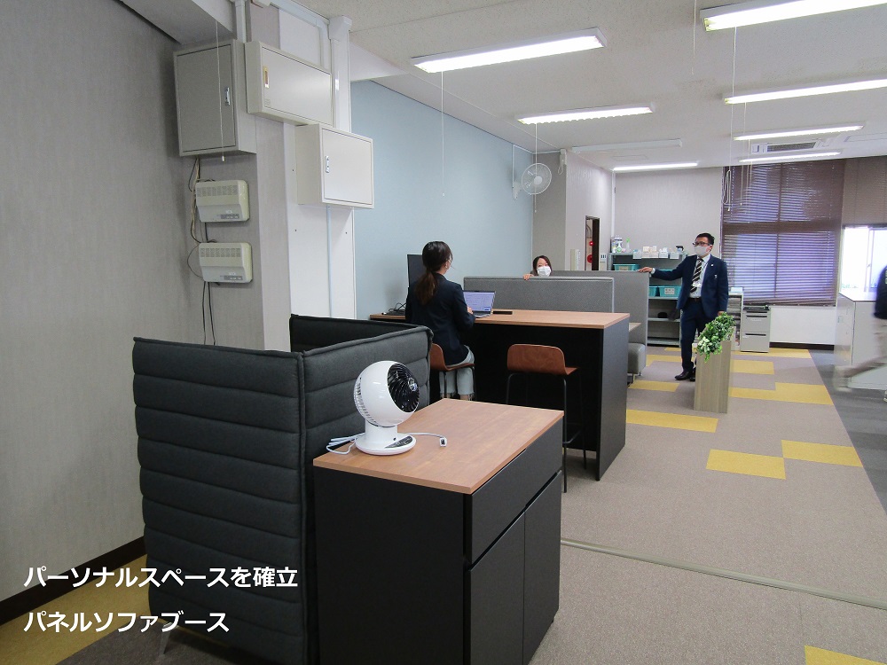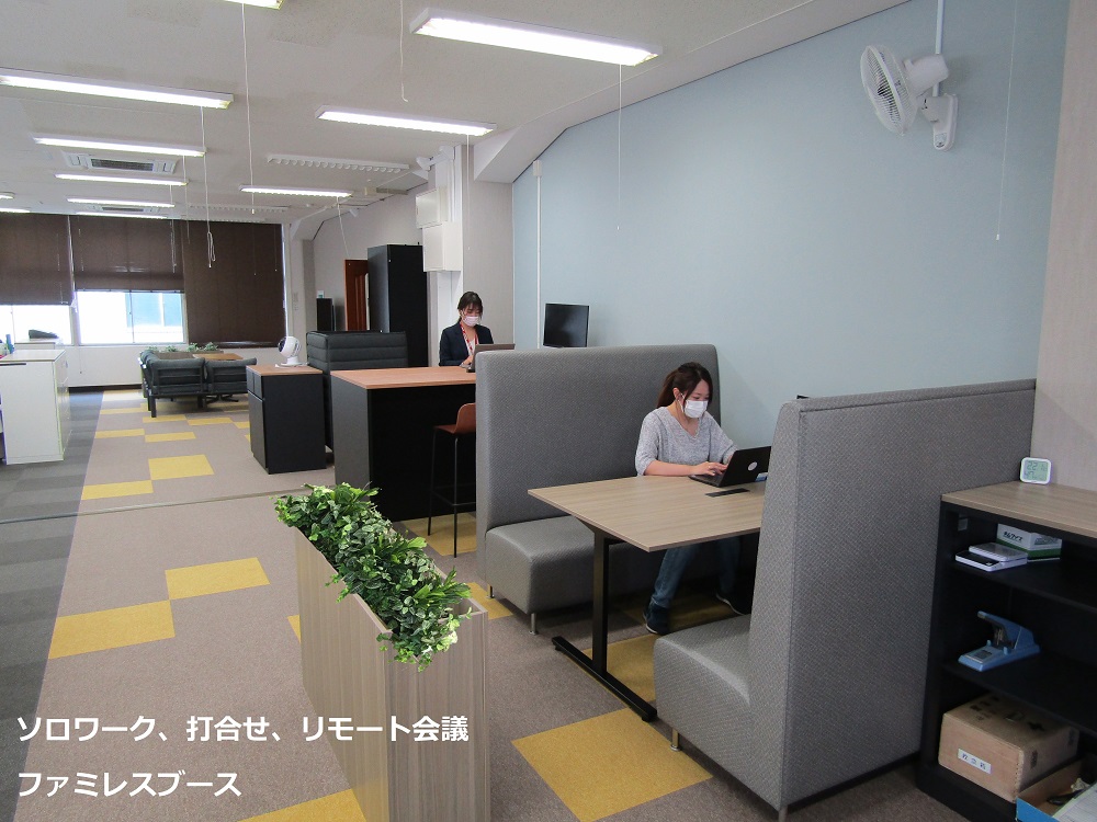 共用スペース部分を新型コロナウィルス禍における「オフィス環境」の変化に基づき、リモートワーク中の社員との対応や、自席以外でのリラックスしながらゆとりあるソロワークスペースの確保を共用スペースを広く活用することにより実現することができました。