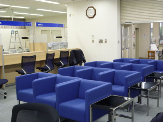 待合のロビーチェアは従来の複数で腰掛けるタイプのものから、一人掛けのソファタイプを納入させていただきました。