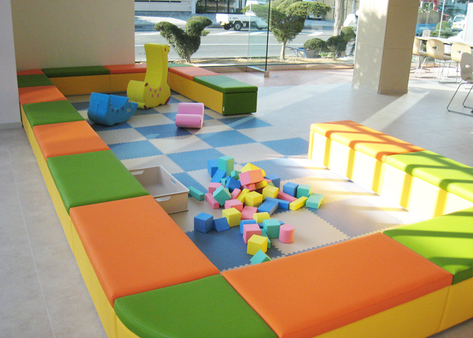 サービスカウンターや商談スペースの家具には優しい木目のカラーの家具を配置し、 キッズスペースにはカラフルなカラーでメリハリをつけました。