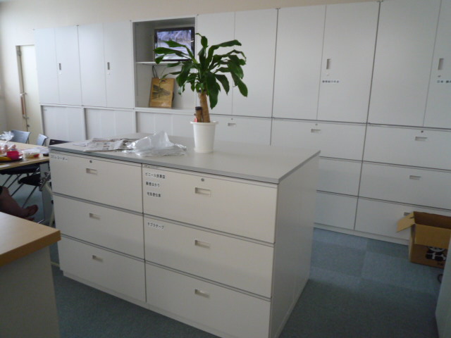 自席を設けずに個人の書類は個人のデスクワゴンに収納して、交代でデスクを使用する「大型天板フリーアドレスデスク」を導入する提案をさせて頂きました。